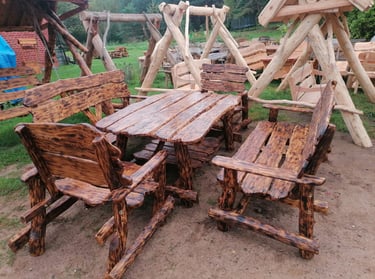 Wspaniały zestaw z drewna dębowego. Postarzany, wypalany i zachowany, nada charakteru każdemu ogrodowi.
