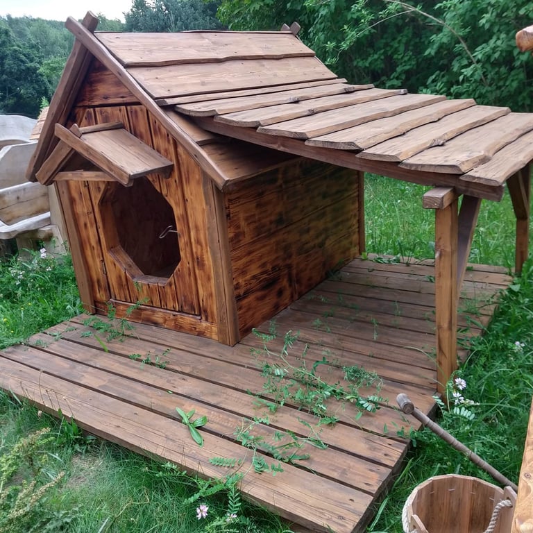 Wyjątkowa chatka dla dzieci z imponującą wieżą o wysokości 4 metrów i dwoma poziomami. Obok znajduje się przestronna jadalnia wyposażona we wszystko, co potrzebne do wspólnej zabawy. Dwuspadowy dach nadaje całości unikalny, magiczny charakter.